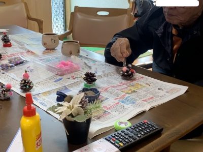 今回は、デイサービスを利用経験がないお二人だったので、少し緊張する場面がありましたが、クリスマスに向けてミニツリー製作やセラピーを行うと少しずつ笑顔が見られました。初めての体験なのでゆったりとした体験利用となりました~・・笑